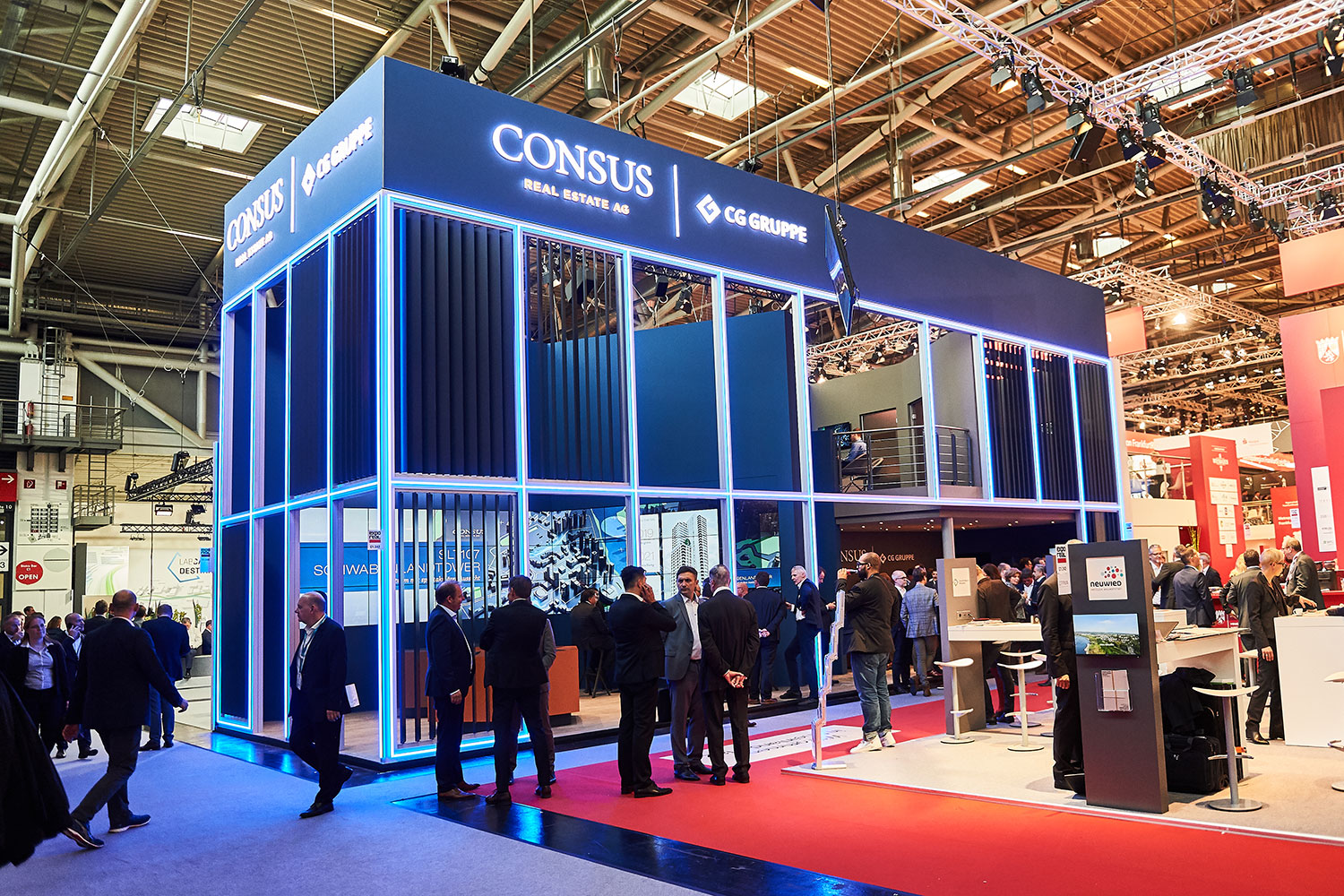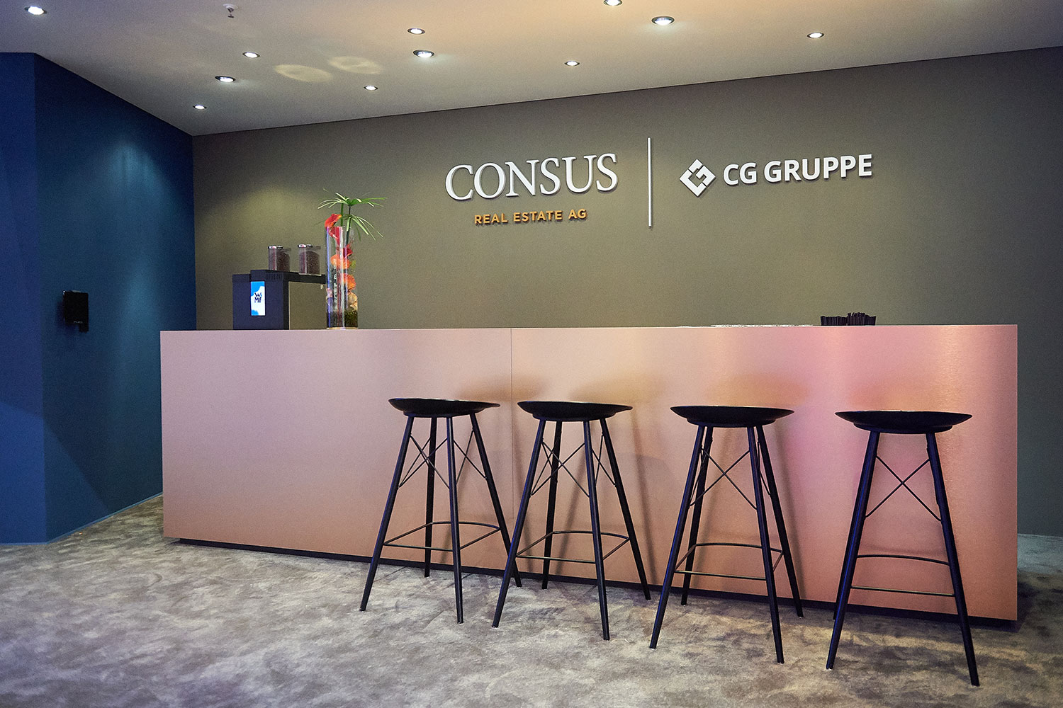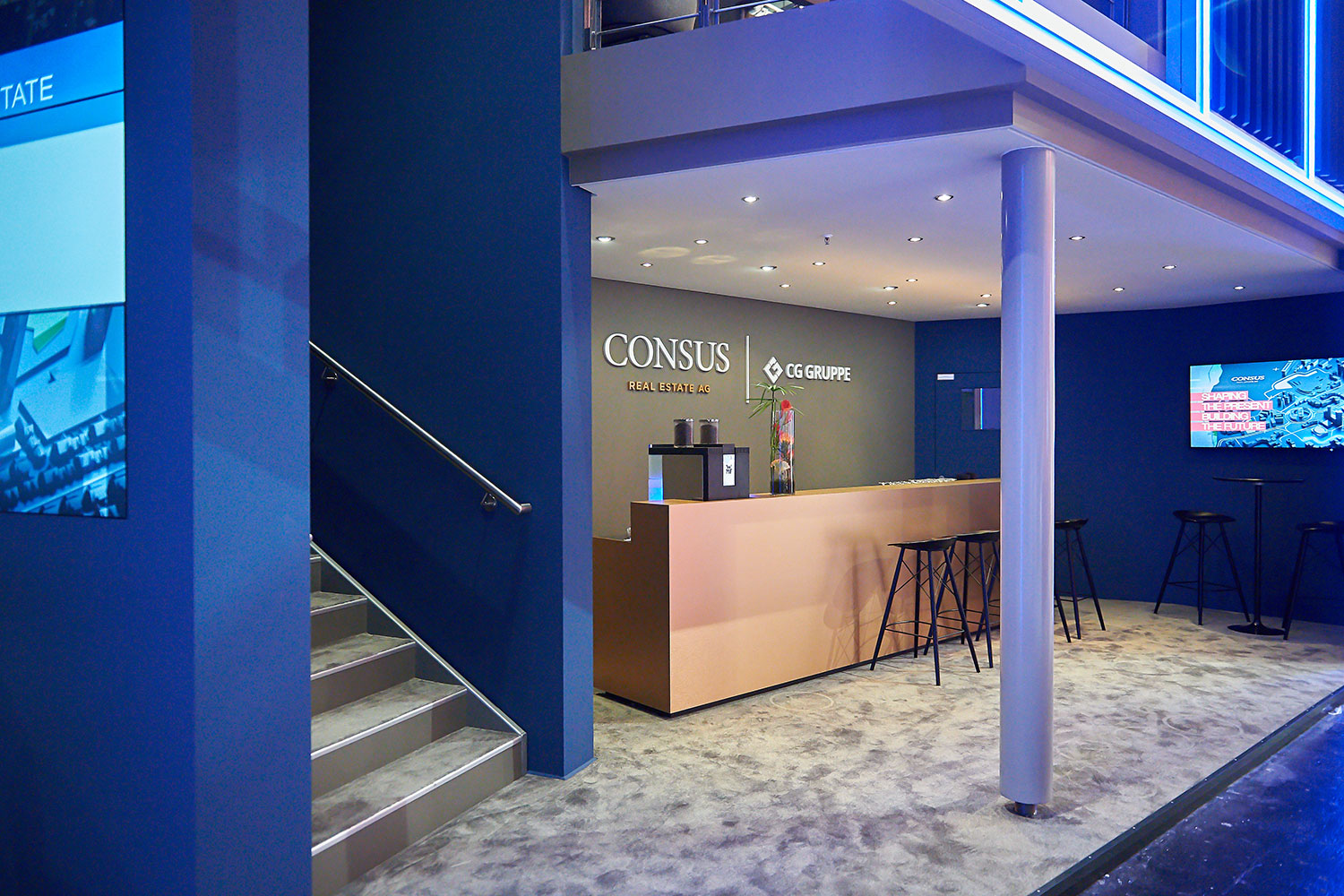 Die Herausforderung: der Messestand soll sowohl dem Anspruch der CONSUS Real Estate als Innovations-, Technologie- und Meinungsführer der Branche gerecht werden als auch ausgewählte Highlightprojekte vorstellen und als kommunikativer Hotspot für Mitarbeiter und Geschäftspartner dienen.