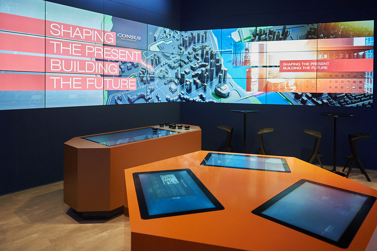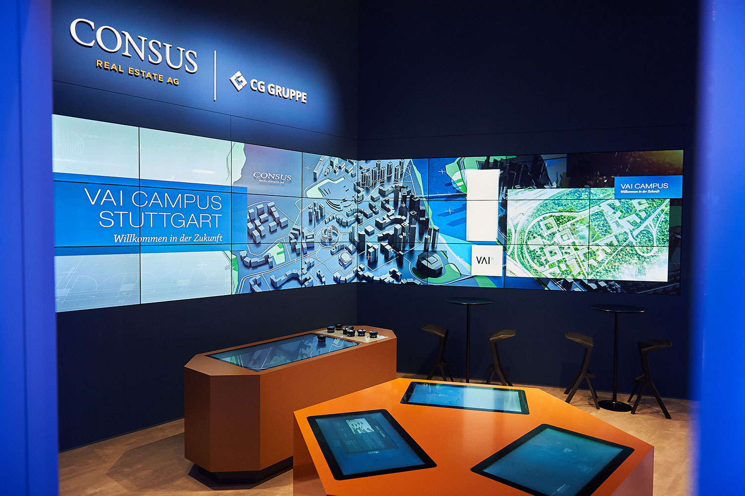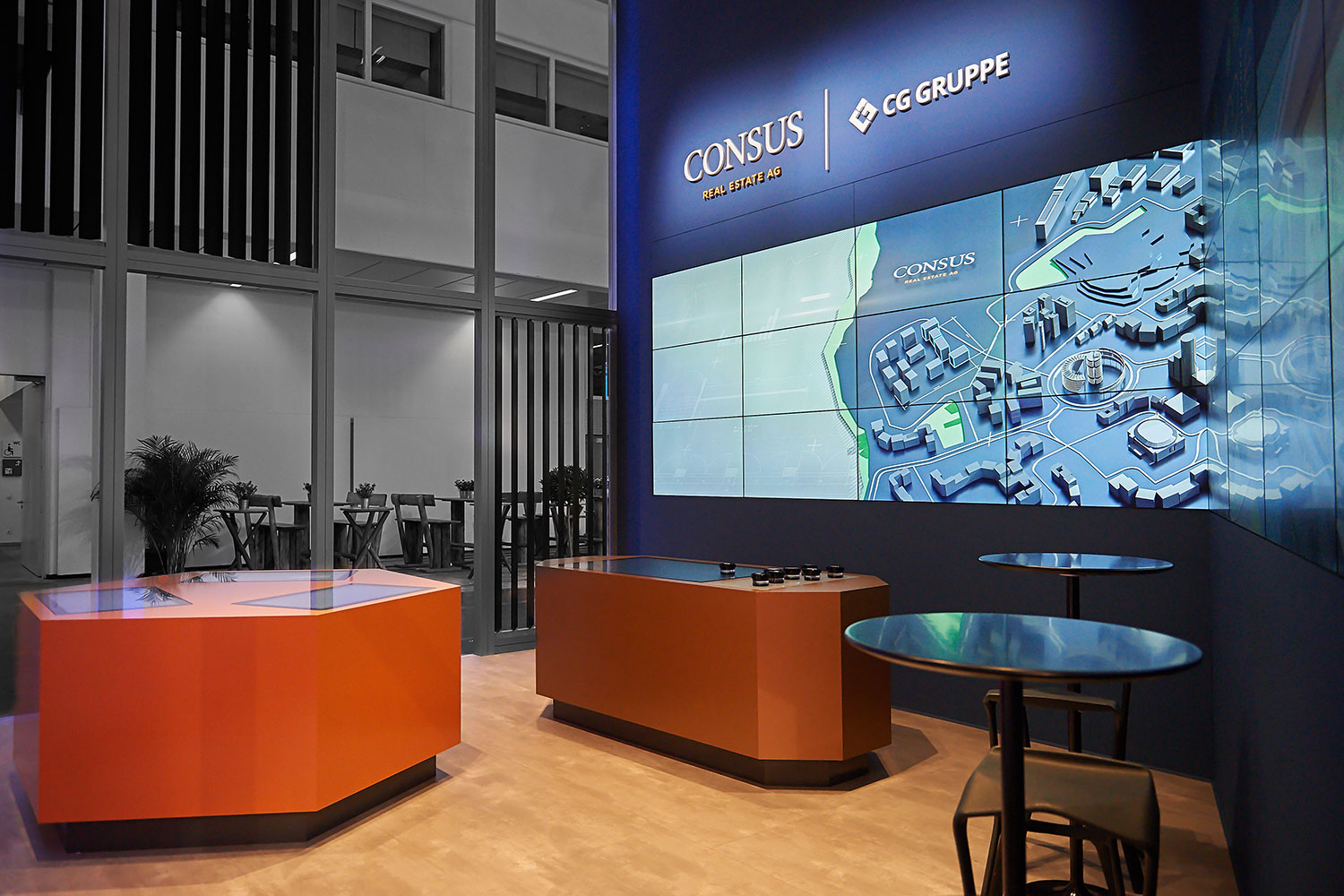 Stellvertretend für insgesamt 68 Immobilienprojekte werden 6 Highlights herausgegriffen und in Form einer interaktiven Medieninstallation vorgestellt. Ein großformatiges Medienband, bespielt mit hochauflösendem Content, bildet den visuellen Höhepunkt des Messestandes. Multitouch-Screens mit Objekterkennung ermöglichen es dem Vertriebs-Team darüberhinaus dem interessierten Messepublikum auf smarte und unkonventionelle Weise das Projektportfolio vorzustellen (Interactive Project Exploration). Eine Bar, exklusive Meetingräume im Obergeschoß und eine hochkarätig bestezte Podiumsdiskussion mit anschließender Standparty bieten willkommene Gelegenheiten für vertrauliche Gespräche und Networking.