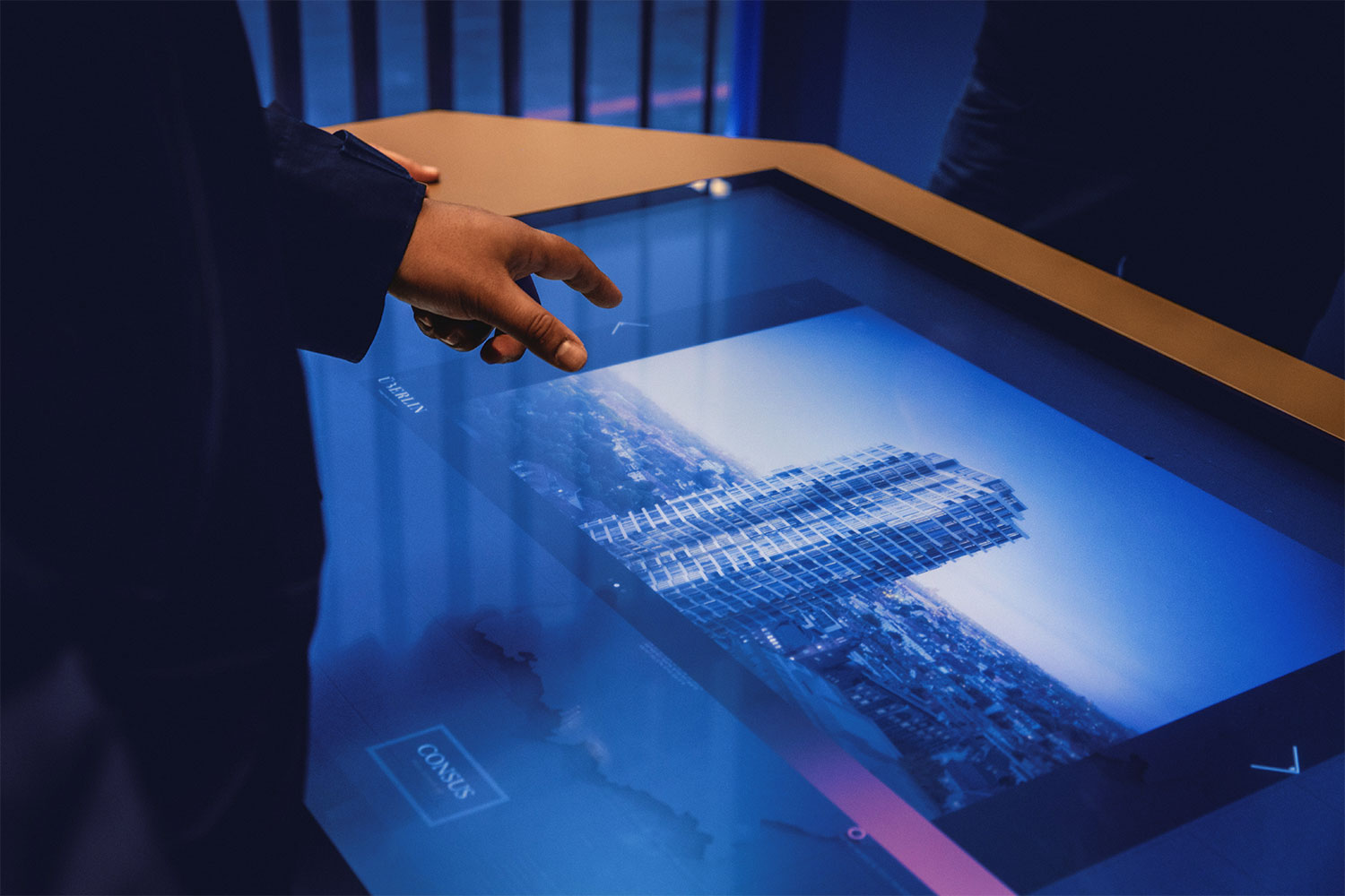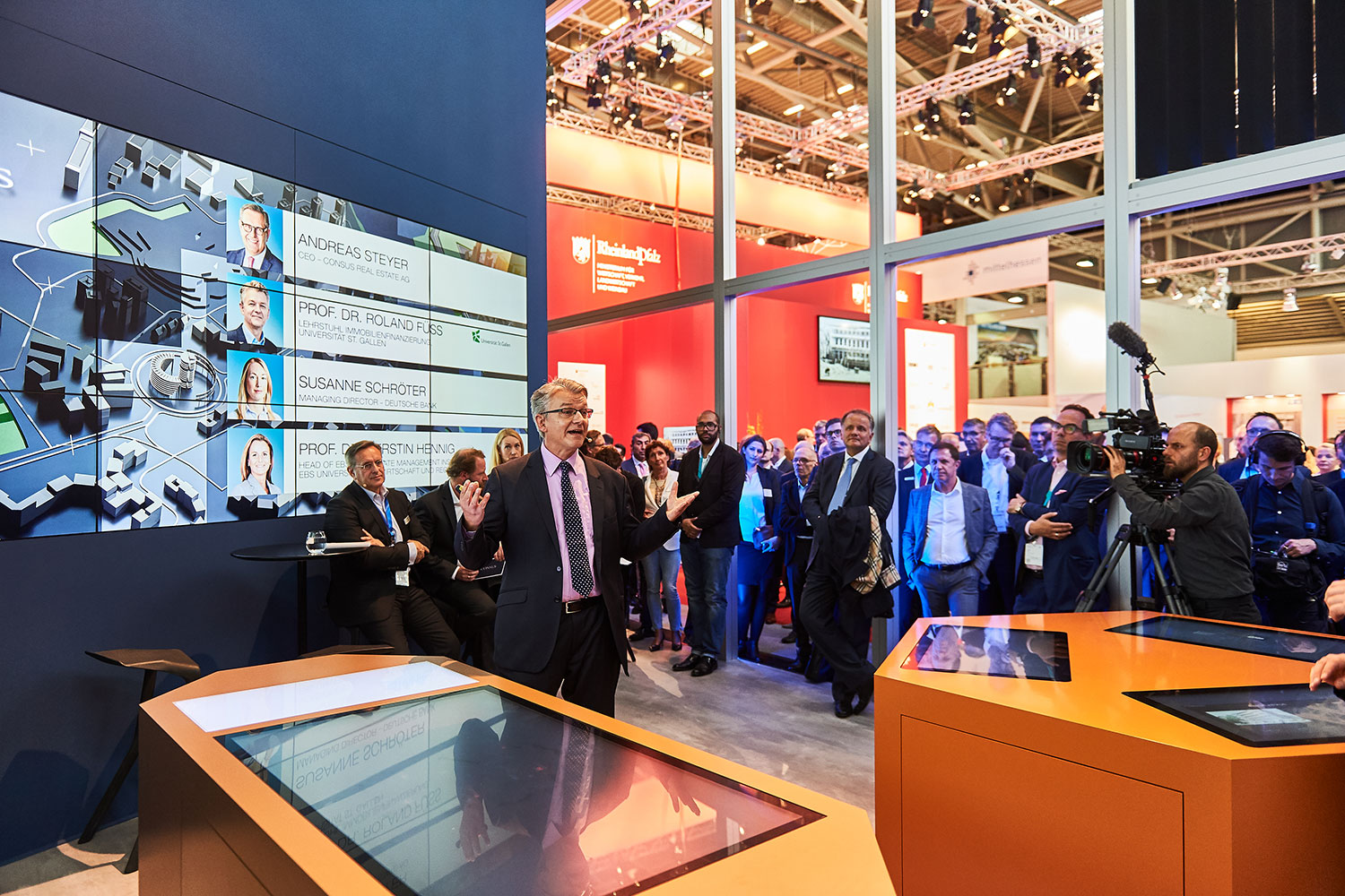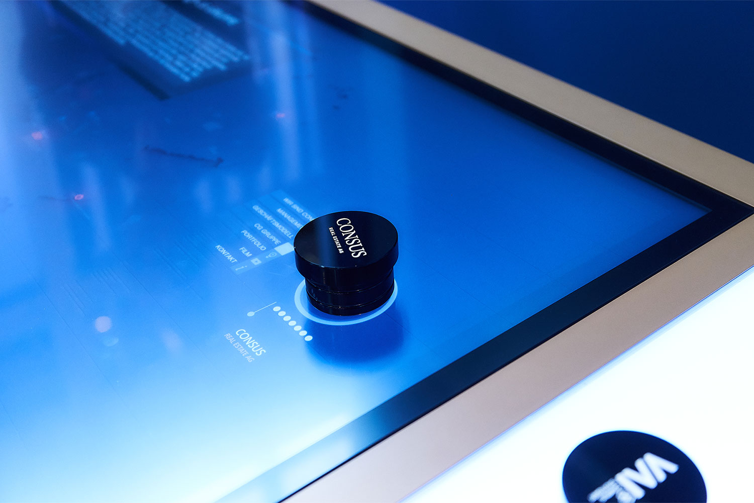 Stellvertretend für insgesamt 68 Immobilienprojekte werden 6 Highlights herausgegriffen und in Form einer interaktiven Medieninstallation vorgestellt. Ein großformatiges Medienband, bespielt mit hochauflösendem Content, bildet den visuellen Höhepunkt des Messestandes. Multitouch-Screens mit Objekterkennung ermöglichen es dem Vertriebs-Team darüberhinaus dem interessierten Messepublikum auf smarte und unkonventionelle Weise das Projektportfolio vorzustellen (Interactive Project Exploration). Eine Bar, exklusive Meetingräume im Obergeschoß und eine hochkarätig bestezte Podiumsdiskussion mit anschließender Standparty bieten willkommene Gelegenheiten für vertrauliche Gespräche und Networking.