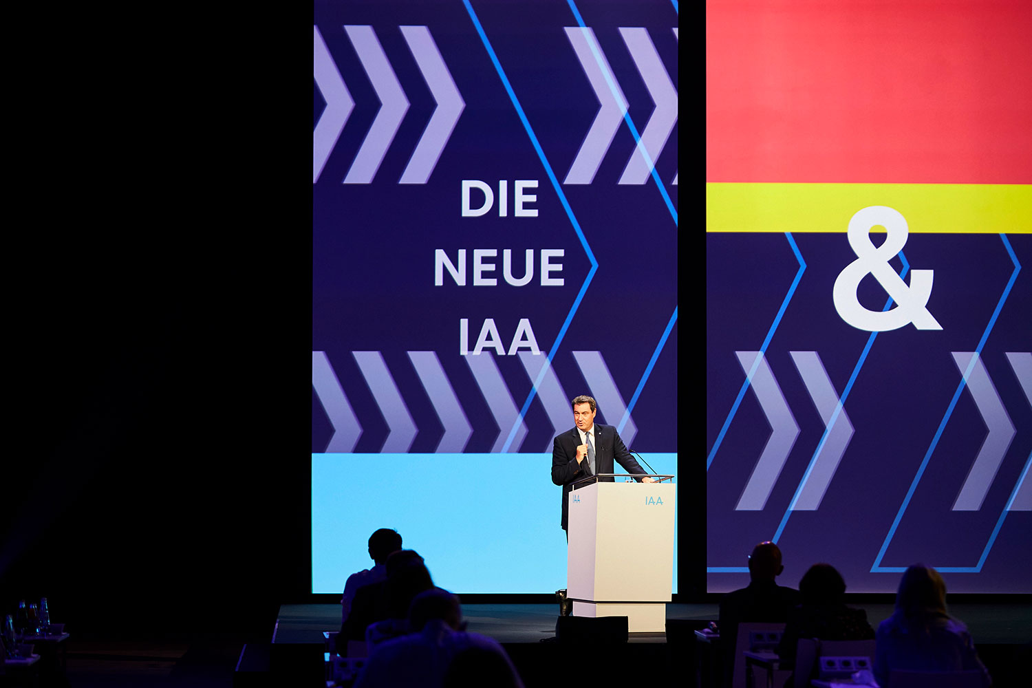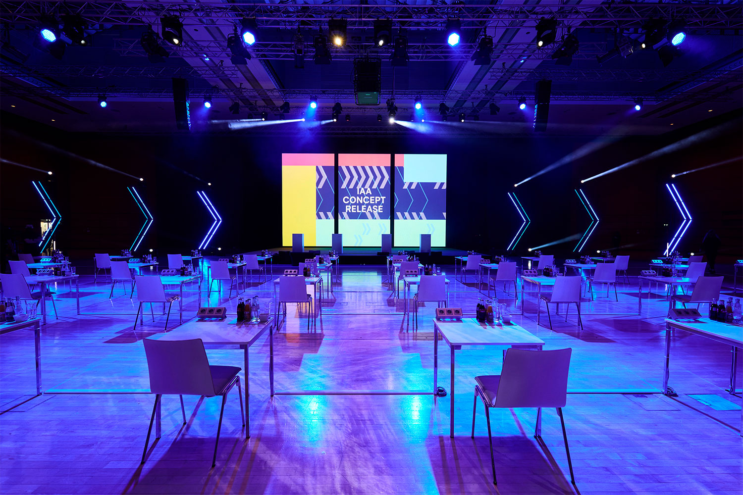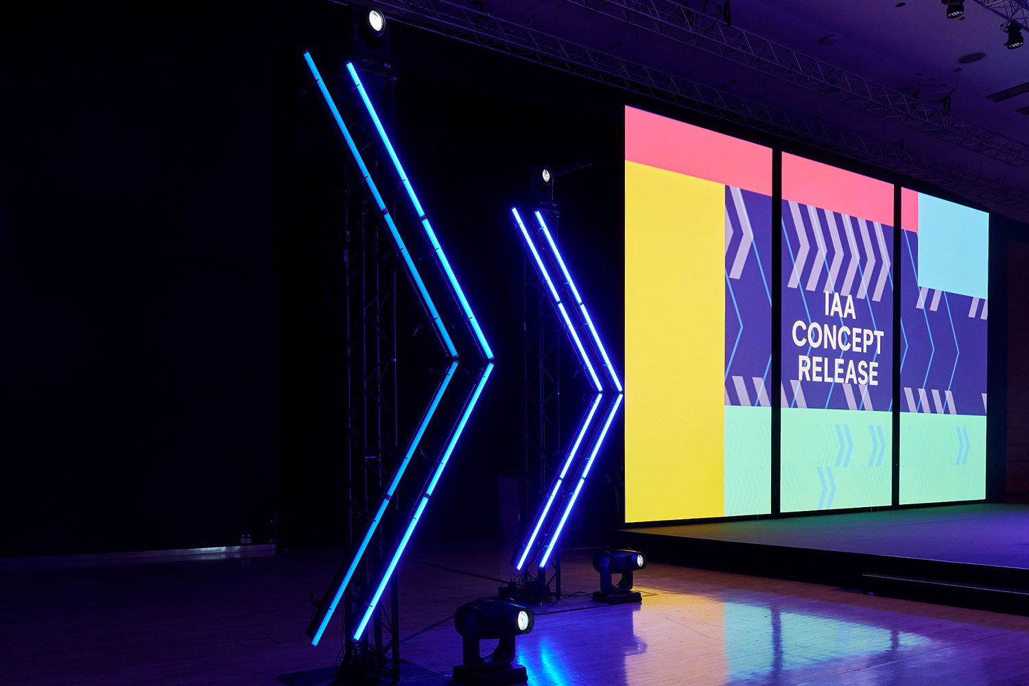 Drei XXL Leinwände als medialer Background greifen die neuen Säulen der IAA konzeptionell auf. Eine atmosphärische Installation aus Lichtstelen zitiert die ikonischen IAA Pfeile und verleiht dem ansonsten leeren ICM einen außergewöhnlichen Charakter.